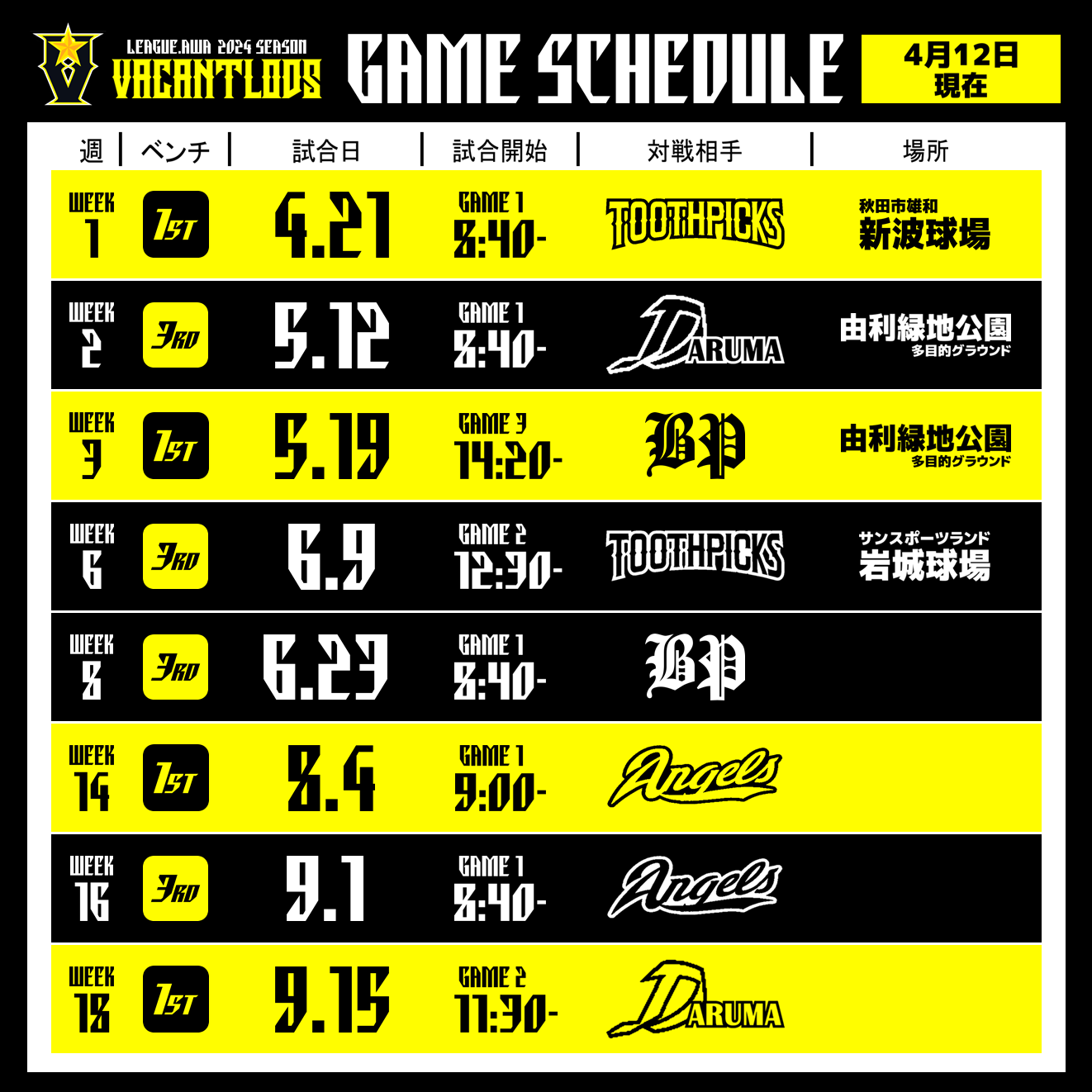 この度、ヴェイカントロッズの2024シーズン試合日程が決定しました。
